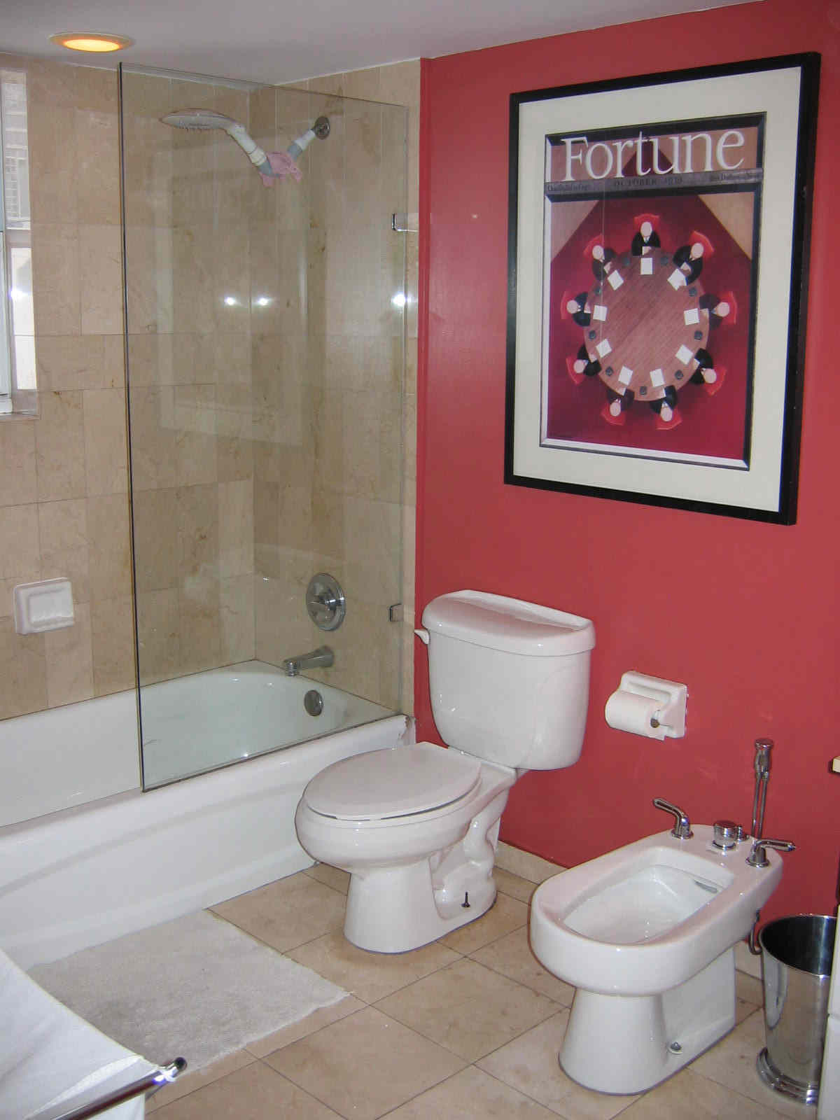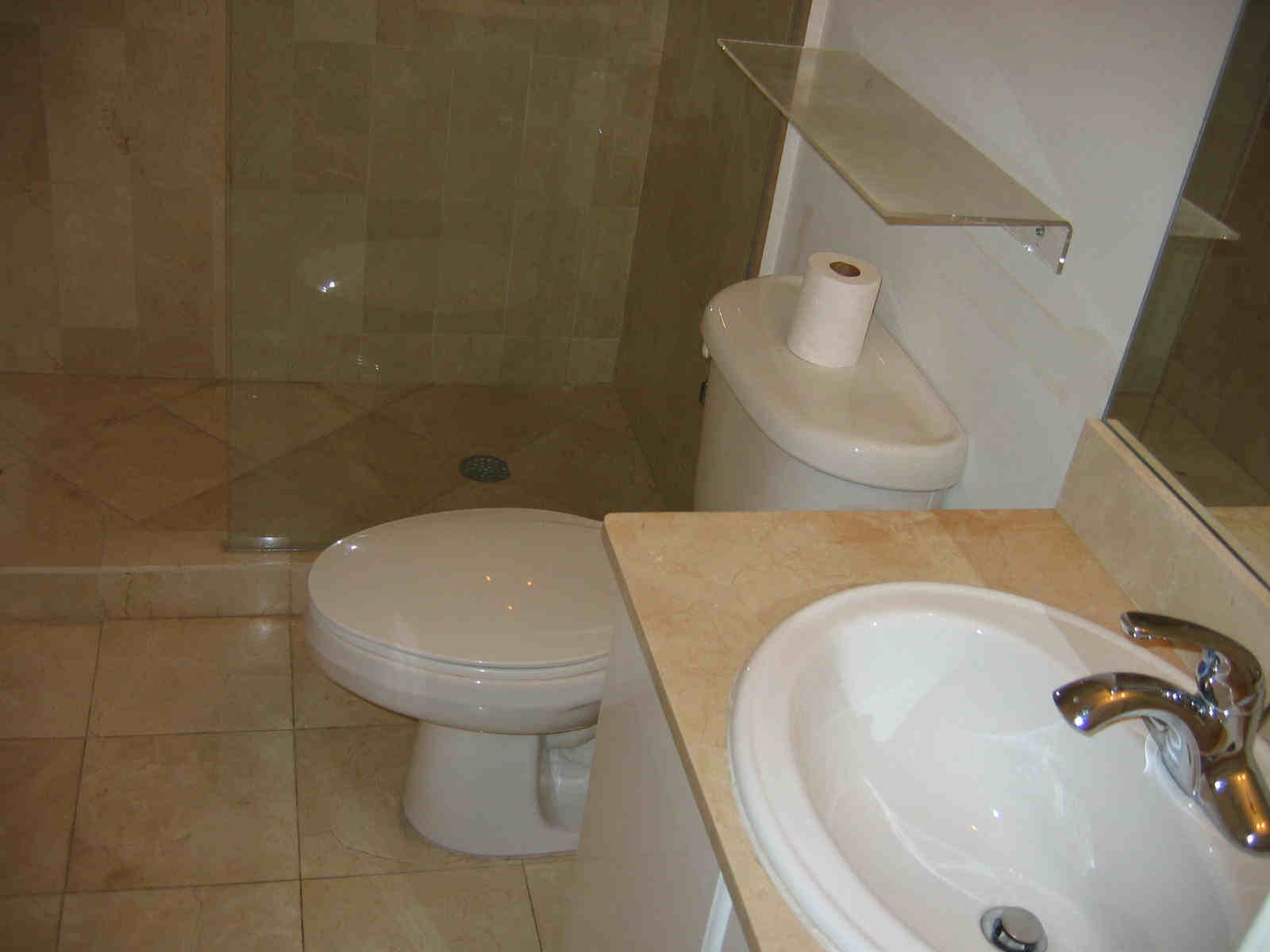 2 bathrooms: All Marble. Large Master bathroom has a tub and a bidet. 2nd bathroom has a shower.